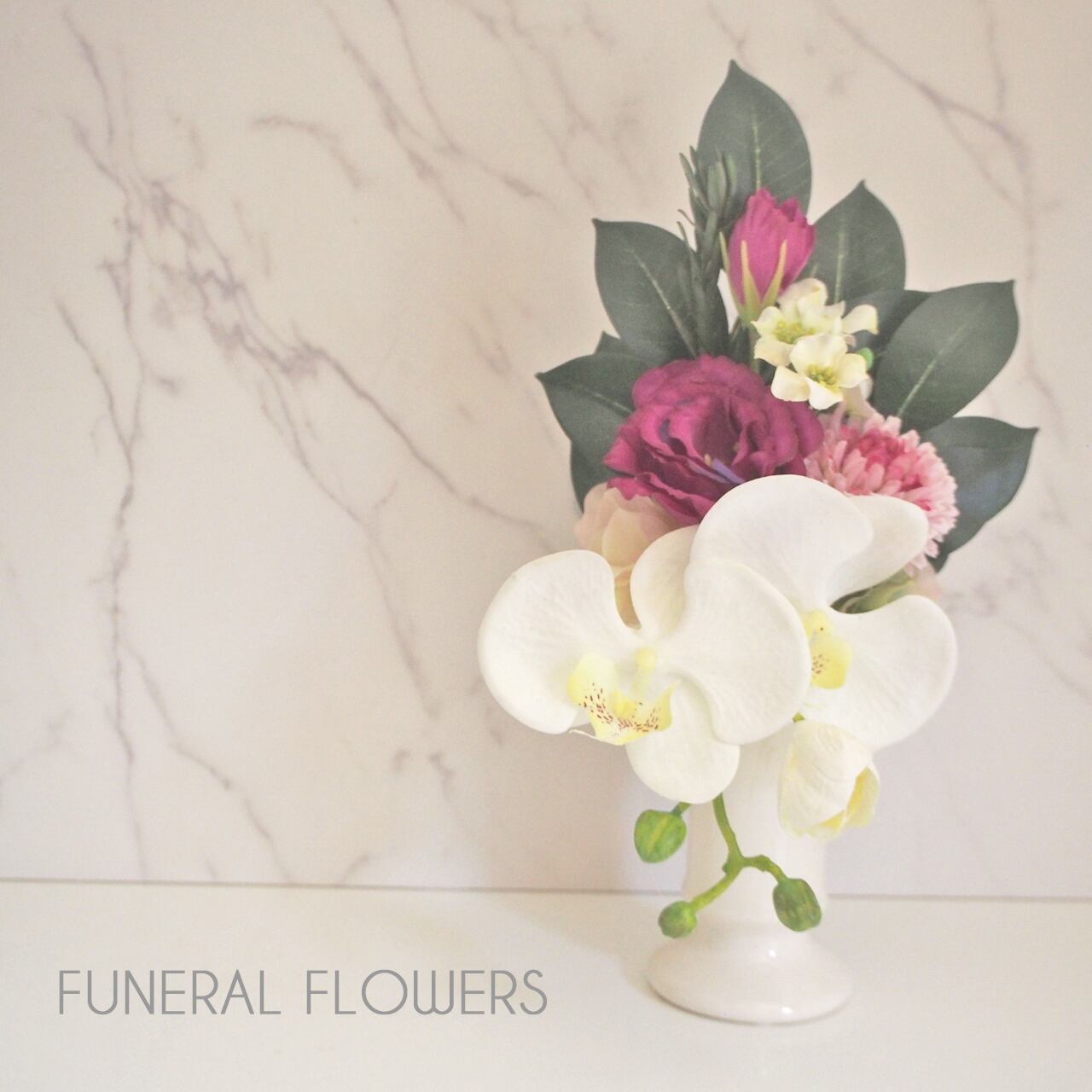 上品でお手入れいらず、アーティフィシャルフラワー(造花)の仏花です。