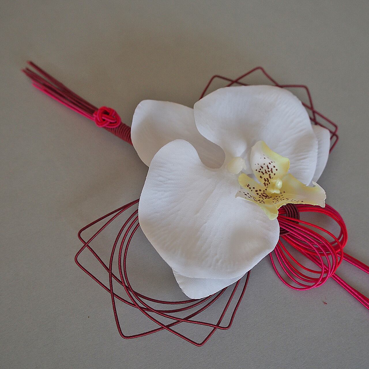 縁起の良い鶴の水引飾り。より豪華に造花の胡蝶蘭をつけました。